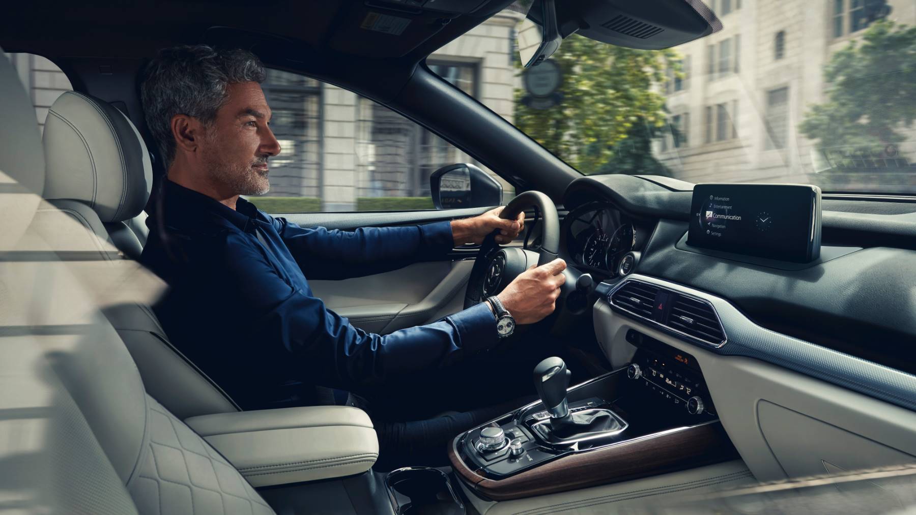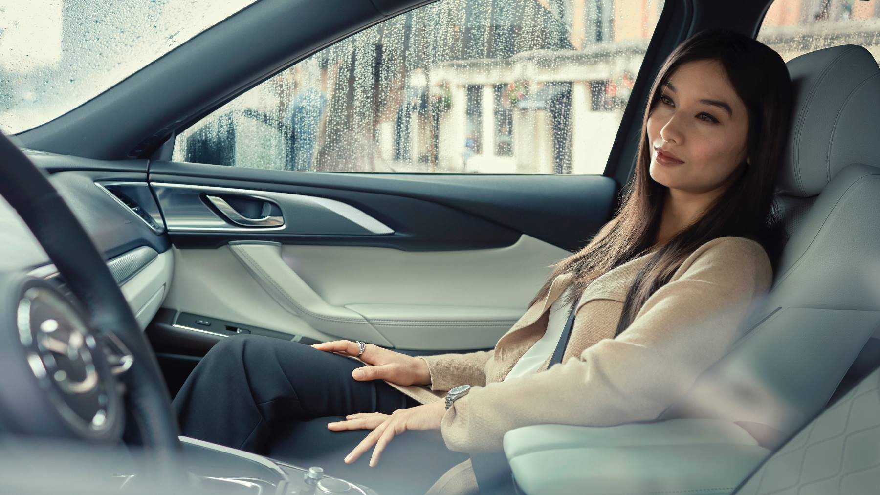 Safety features on the CX-9 help reduce your risk of an accident or prevent an accident from occurring. The vehicle's many standard safety features include forward collision warning, lane departure warning, and lane-keep assist. Additional features such as blind-spot monitoring, rear cross-traffic alert, and forward automatic emergency braking allow you to navigate busy city streets with increased safety.